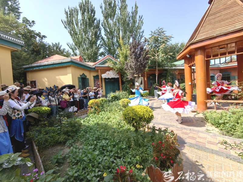 9月8日,在伊宁市六星街景区,演艺人员跳起了热情的迎客舞。